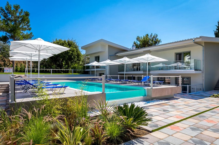 Луксозният хотел се намира на златистия пясъчен плаж в Dassillio Scala Prinos, награден със син флаг за своите кристално чисти тюркоазени води.