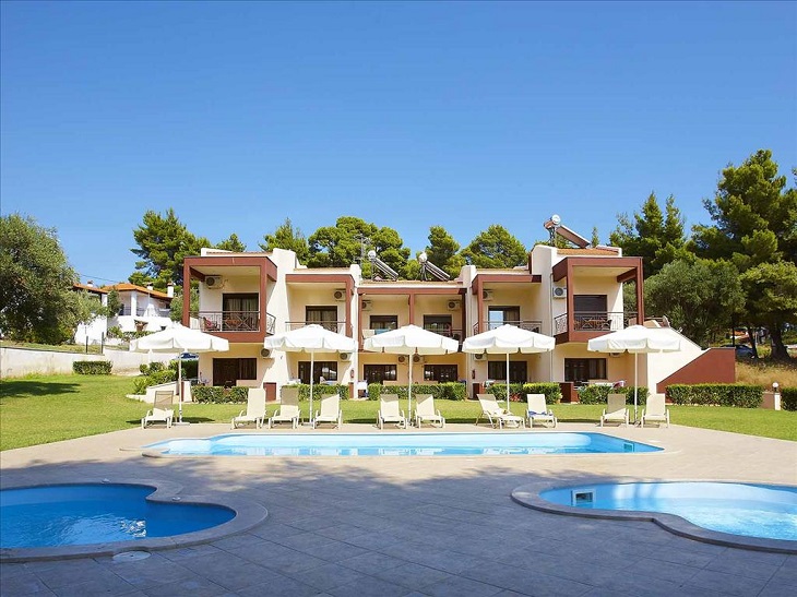 Хотелът разполага общо с 45 стаи в девет категории, всички напълно оборудвани, с изглед към сините води на залива Торонеос, басейн или градина.